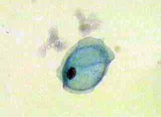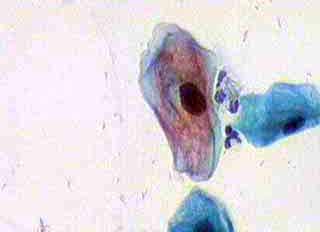 Ασυμπτωματική σθενής 23 ετών. Κολποσκοπικως κφ. Δοκιμασίες οξικου οξέως και lugol αρνητικές. Ακολουθούν εικόνες του έτους 2000: Kύτταρα κυρίως της επιφ. καi διαμέσου στιβάδος, κάπως μικρότερα απ' ότι συνηθως, με αρραιοχρωματικους φυσαλιδοειδείς πυρήνες . Πολλά απο αυτά με διακριτική κοιλοκυττάρωση και εκφυλυστικές αλλοιώσεις του πυρήνα. Επίσης αρκετά γιγαντιοκύτταρα και εκφυλιστικές αλλοιώσεις πυρήνων με διάλυση και εν μέρει ομοιογενοποίηση της χρωματίνης, που δίνουν την εικόνα θολού γιαλιού. (Mattglasphaenomen). Aρραιή βακτ. χλωριδα. Λιγα πολυμορφοπύρηνα. Aρνητικό για κακοήθεια. Aλλοιώσεις που συνηγορούν για HSV.