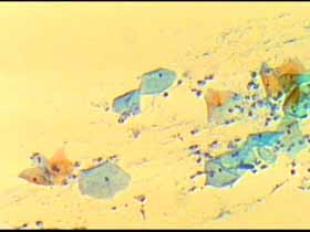 Πλακωδη επιθηλιακα κυτταρα κυριως της επιφανειακης στιβαδος, περιπου κατα 30% οξεοφιλα, λίγα της διαμεσου και σπανια της παραβασικης. Ωστοσο στο ενδοτραχηλικο επχιρισμα αρκετα ενδομητριου και αφθονοι γυμνοι αρραιορωματικοι πυρηνες προφανως αδενικων κυτταρων ενδοτραχηλου, μερικως ανισομεγέθεις Λιγα πολυμροφοπύρηνα. Ασυνήθιστο για ημερα κυκλου