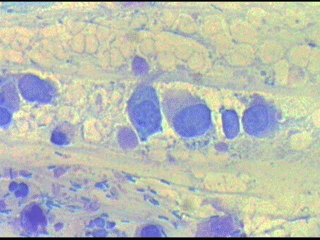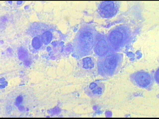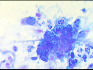Διαπιστώνεται πληθώρα κυρίως διογκωμένων, εν μέρει αρραιοχρωματικών ανισομεγέθων πυρήνων αδενικών κυττάρων ..
