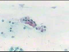 Papanicolaou. Τυπική εικόνα ατροφιας επιθηλίου με παρουσία κυτταρων κυρίως της παραβασικής και λιγότερο της διαμέσου στοιβάδος, με την αναμενόμενη πολυμορφία της ατροφίας του επιθηλίου και τις αναμενόμενες εκφυλιστικές αλλοιώσεις.. Αρκετά κύτταρα ενδοτραχήλου κατα μόνας και καθ΄ ομάδας.. Λιγα πολυμορφοπύρηνα. Αρνητικό για κακοήθεια..Φυσιολογικό για την ηλικία.