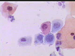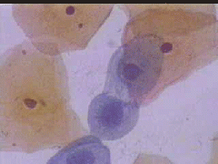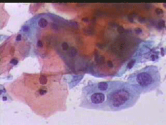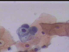 Πλακωδη επιθηλιακά κύτταρα κυρίως της επιφανειακής και λιγώτεροτης διαμέσουστιβάδας. . Λίγα της παραβασικής καθώ και πολύλίγα του ενδοτραχήλου .. Σε πολλάοπτικάπεδία ομάδες κυττάρων της παραβασικής και λιγων της διαμεσου στιβαδος, με διογκωμένους, αρραιοχρωματικούς και ανισομεγέθειςπυρήνες, με καλή δομήχρωματίνης. Kαθαρό υπόστρωμα. Yπόνοια για δυσπλασία σοβαρού βαθμού (CIN II-III)