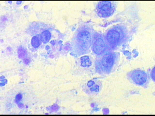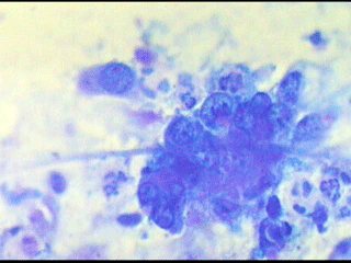 Διαπιστώνεται πληθώρα κυρίως διογκωμένων, εν μέρει αρραιοχρωματικών ανισομεγέθων πυρήνων αδενικών κυττάρων ..