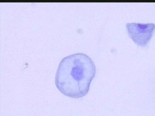 Χρώση κατά Papanicolaou. Πλακώδες επιθηλιακό γιγαντιοκύτταρο με εικόνα κοιλοκυττάρωσης, με διόγκωση του πυρήνα και διάλυση δομής της χρωματίνης. Ερπης εξωτερικών γεν. οργάνων