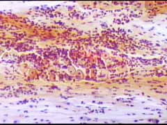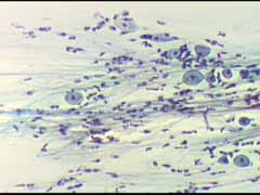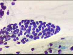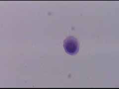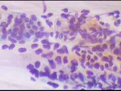 Ενα κυτταρα διαμεσου στοιβάδας και δυο παραβασικά κύτταρα, Το ενα εξ αυτών με μορφολογία που θυμίζει αδενικό κύτταρο Μεγεθ. 10Χ40