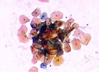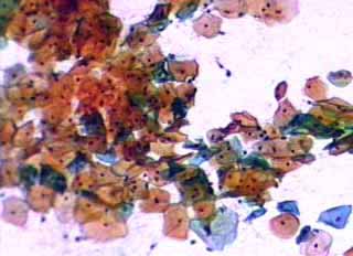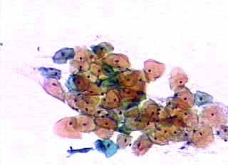 Πλακώδη επιθηλιακά κύτταρα, κυριως της επιφανειακής στιβάδας, περίπου κατά 80-90%οξεόφιλα. Λίγα πολυμορφοπύρηνα. Διακριτική παρουσία κοκκοχλωρίδας. Aρνητικό για κακοήθεια.